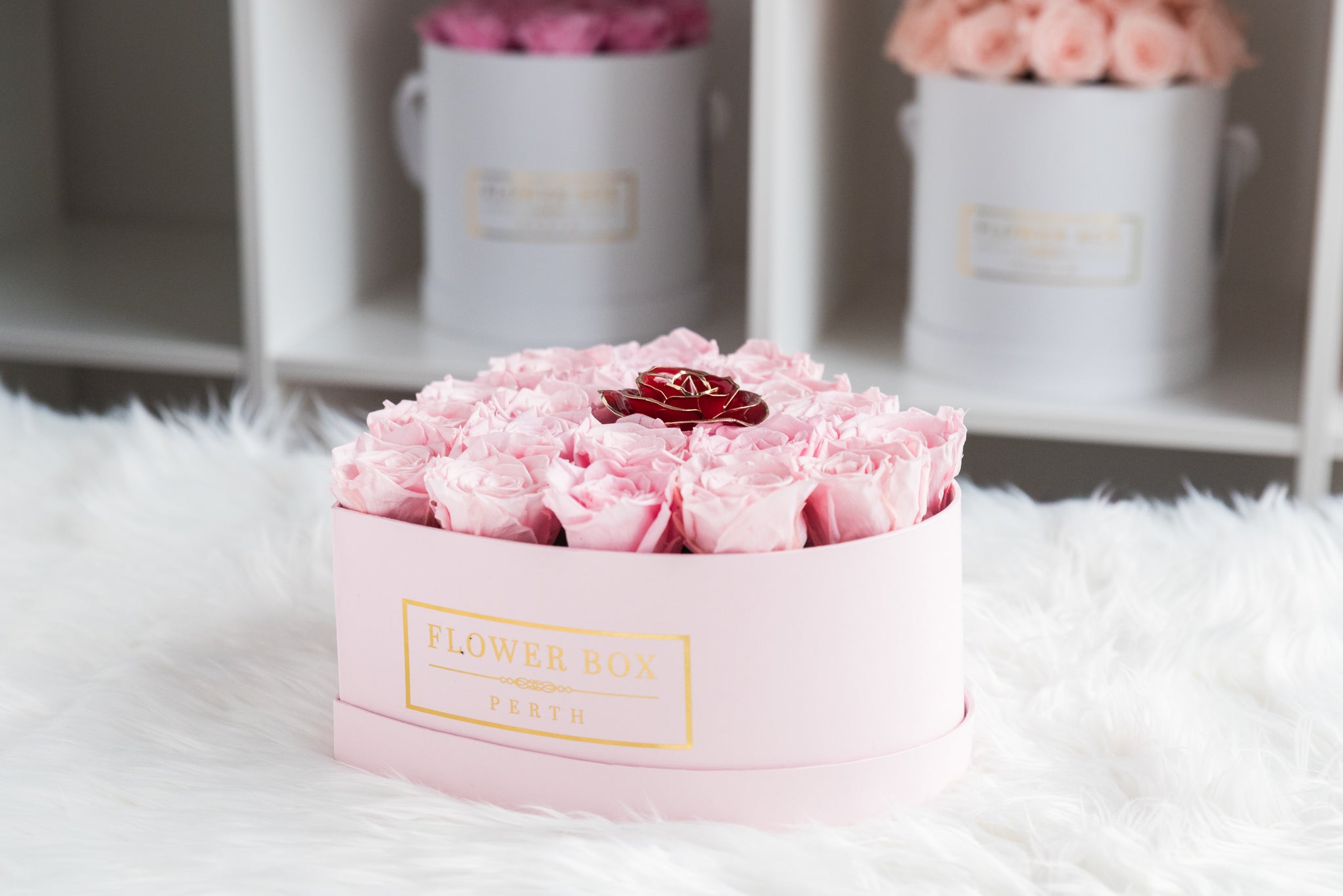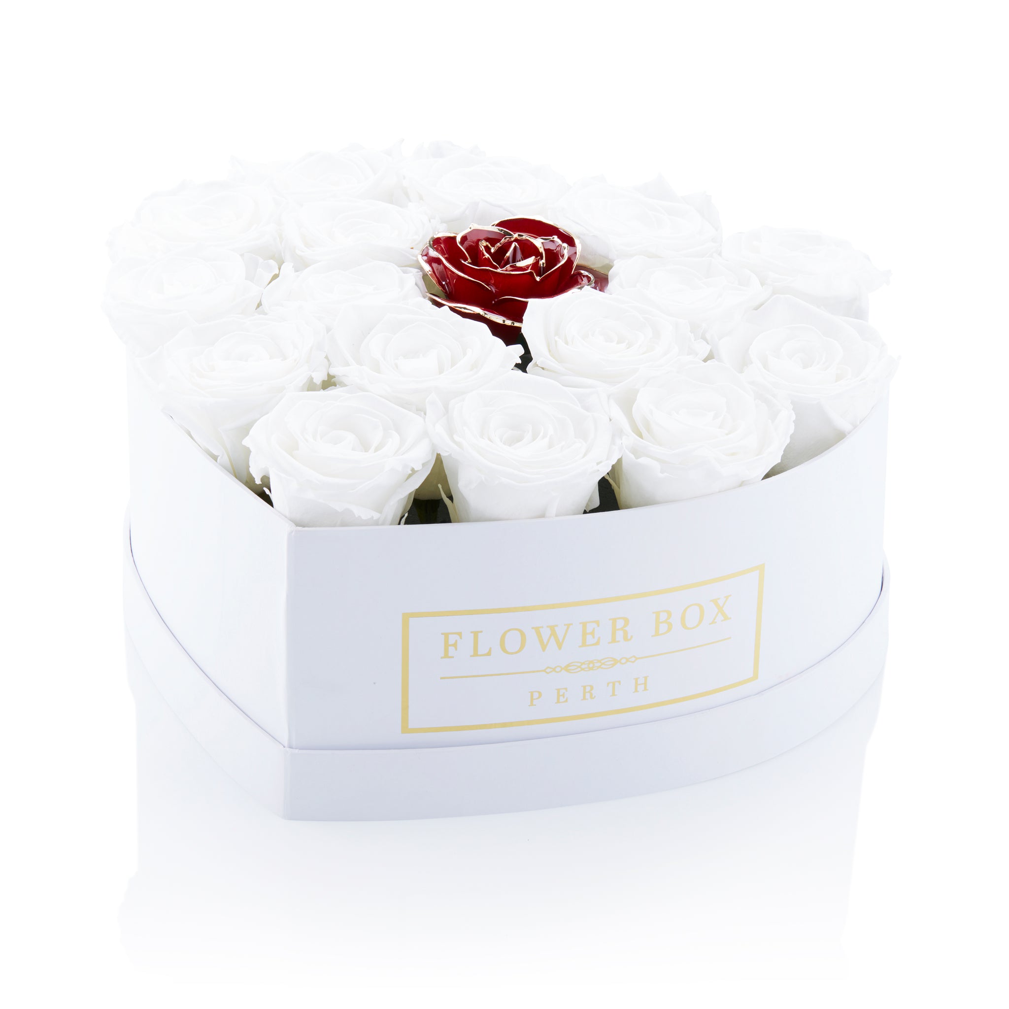 The Queen of Hearts is the perfect luxury rose collaboration between Flower Box Perth and Liquid Luxury. Featuring a Liquid Luxury 24k Gold Mon Petite red rose amongst a bed of preserved roses, in a heart shaped box. The collection is the ultimate gesture of everlasting love or friendship for your special someone.